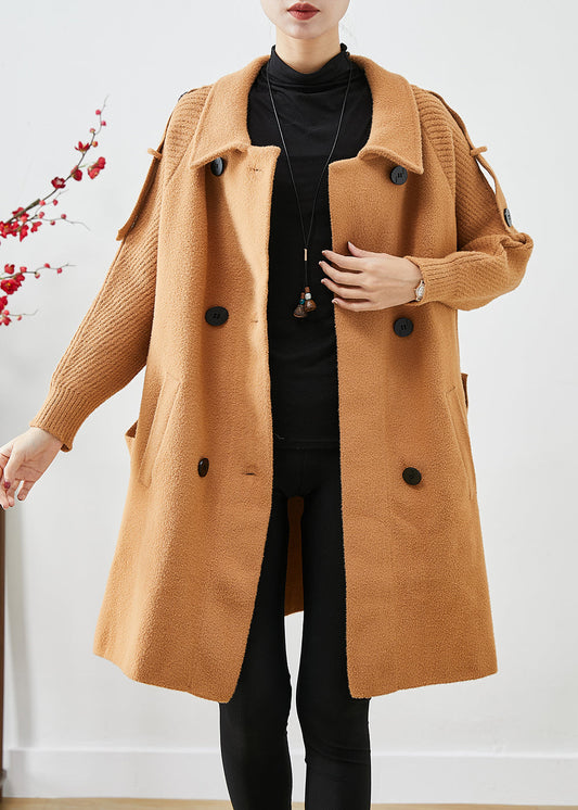 Boho Light Camel Double Breast Patchwork Knit Woolen Trench Coats Fall LY9257