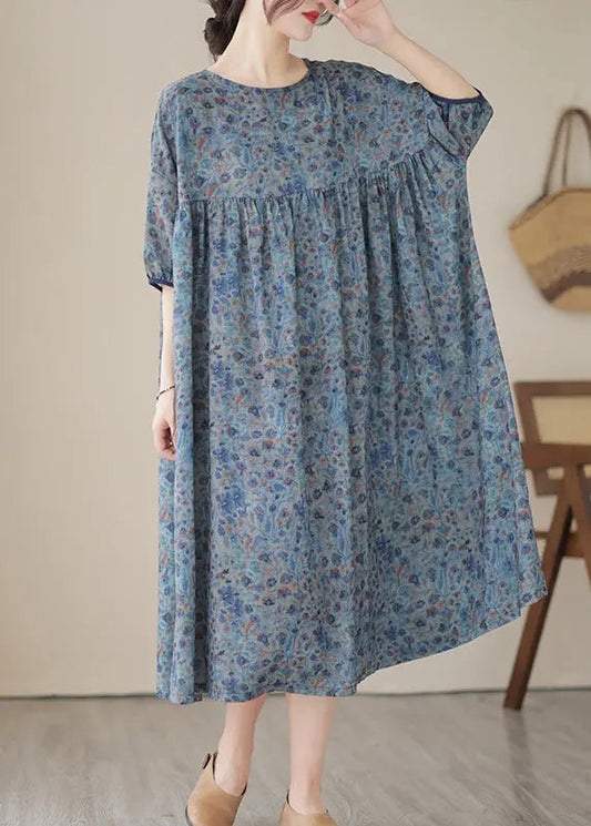 Boho Blue Grey Oversized Print Linen Maxi Dresses Summer LY8657