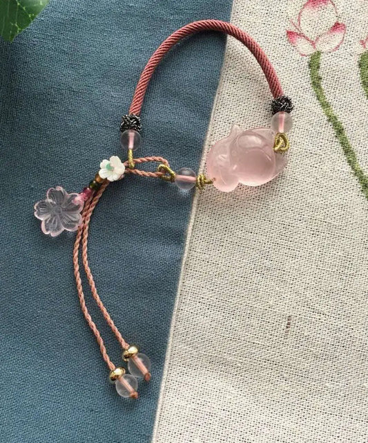 Cute Pink Hand Knitting Crystal Furong Stone Fox Charm Bracelet ML0598