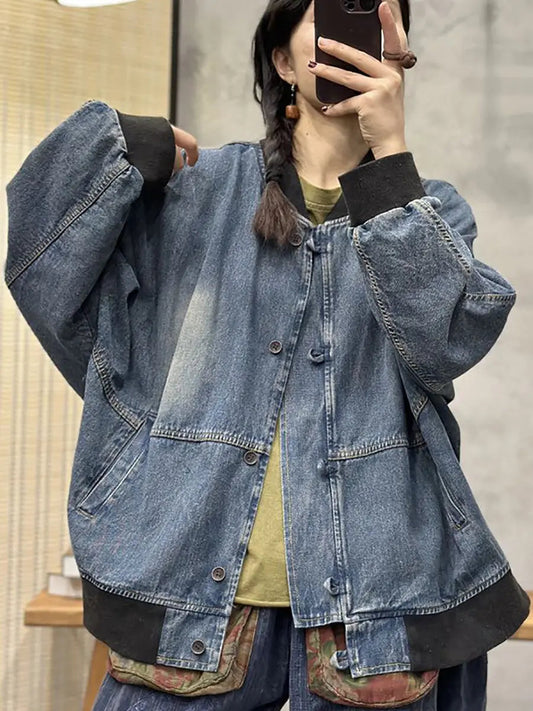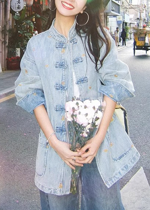 Loose Blue Stand Collar Button Pockets Denim Coats Long Sleeve QA1035