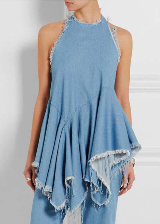 Style Blue Asymmetrical Design Exra Large Hem Denim Vests Sleeveless LY3954