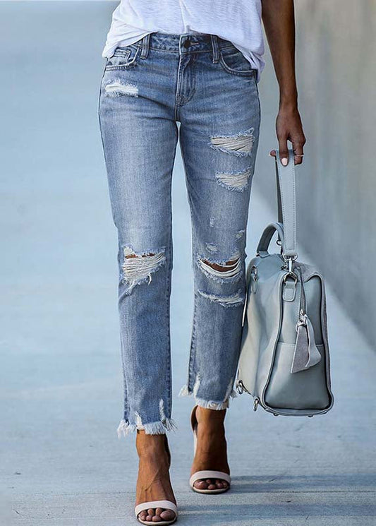 Women Light Blue High Waist Denim Ripped Pants Trousers Summer LY3951