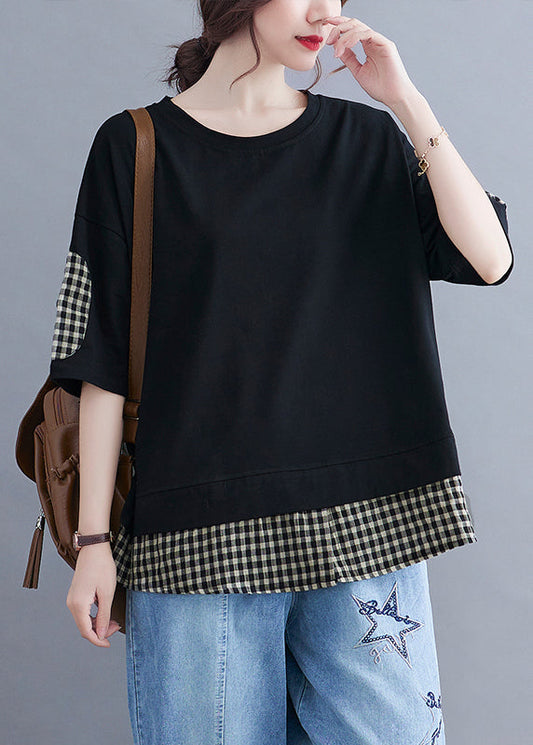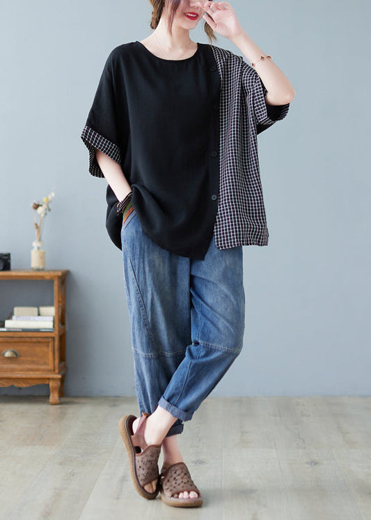 Chic Black Oversized Patchwork Plaid Side Open Cotton Tops Summer LY2388