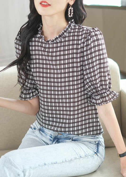 French Plaid Ruffled Patchwork Chiffon Shirt Tops Summer LY1475