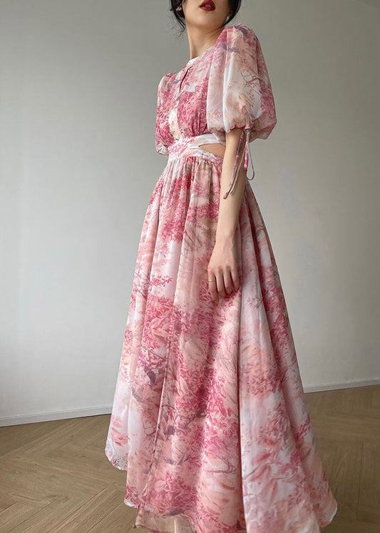 Beautiful Pink O Neck Print Side Open Silk Long Dresses Summer LC0501