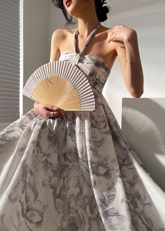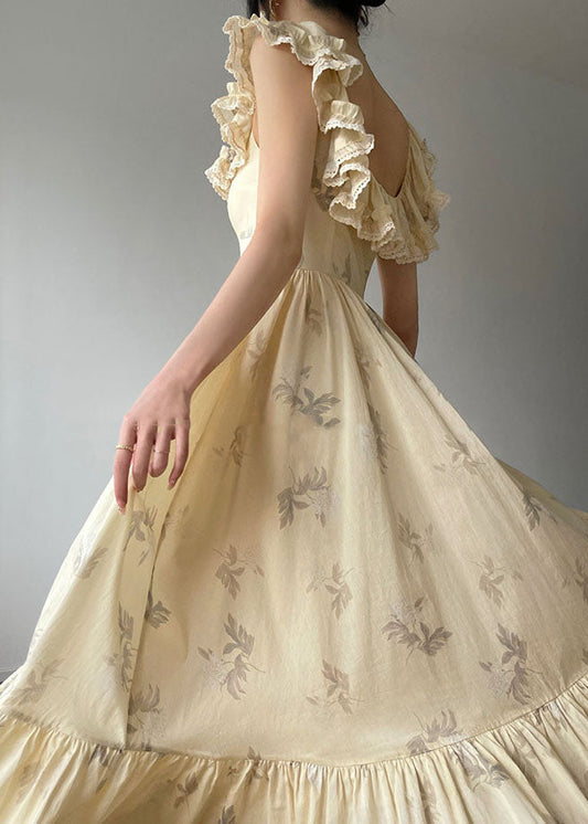 Women Beige Ruffled Backless Print Exra Large Hem Silk Long Dresses Summer LC0496
