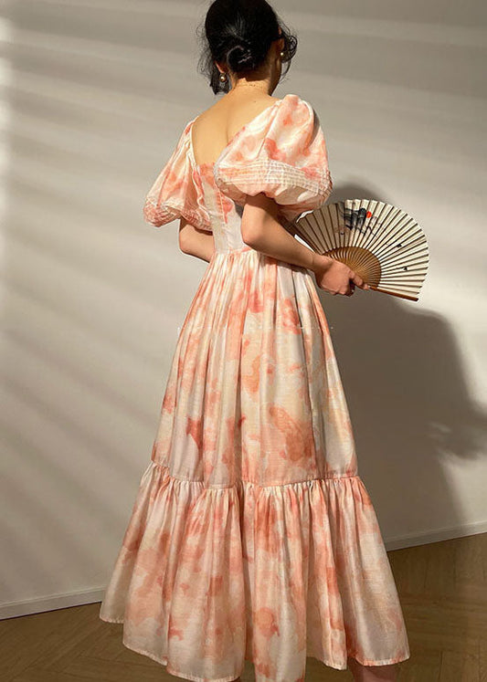 Elegant Pink Square Collar Patchwork Print Silk Dress Puff Sleeve LC0492
