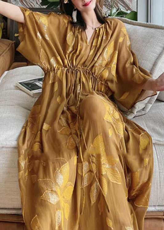Bohemian Apricot V Neck Ink Print Drawstring Silk Cinch Dresses Summer LC0486
