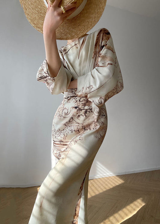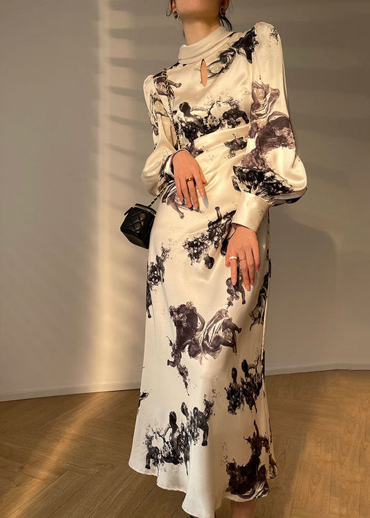 Slim Fit Beige Wrinkled Print Silk Long Dresses Lantern Sleeve LC0487