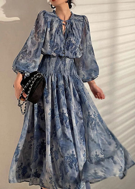 Italian Blue V-Neck Print Wrinkled Chiffon Cinch Dress Spring LC0500