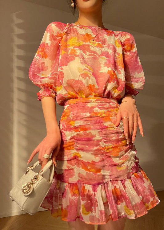 Women Red Wrinkled Print Chiffon Tops And Wraped Skirts Sets Two Pieces Summer LC0503