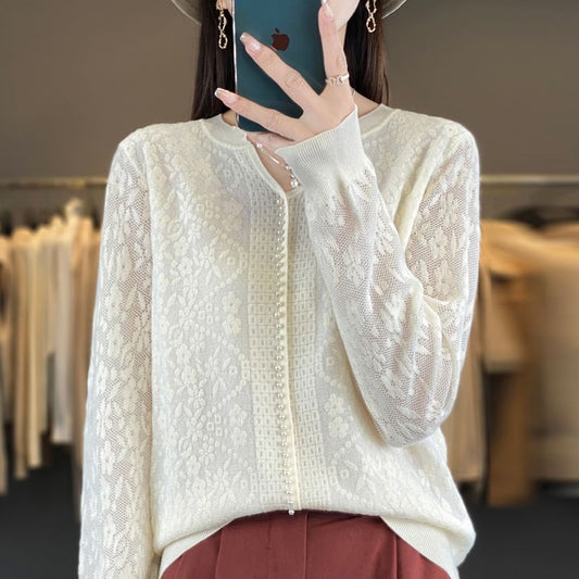 Long Sleeve Notch Neck Floral Patterned Beaded Knit Top