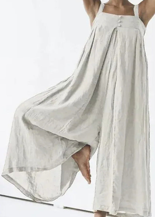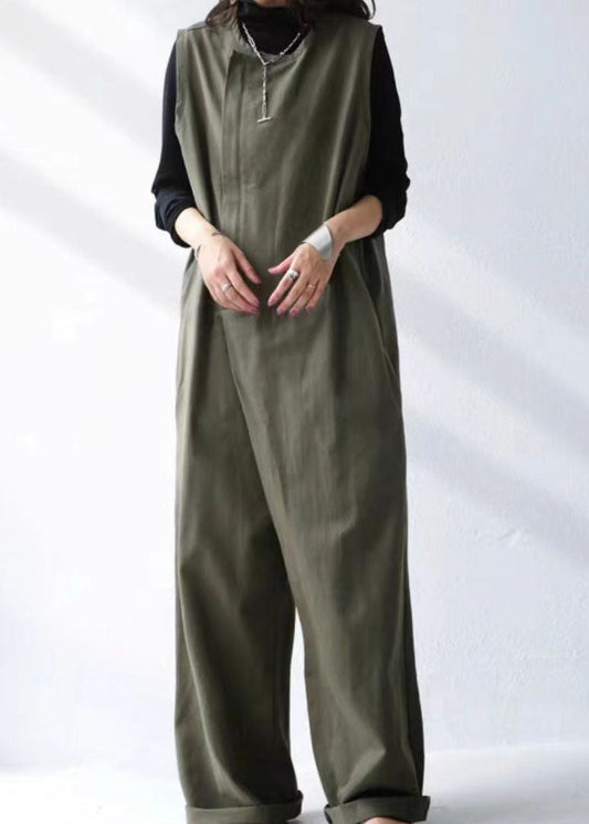 Art Khaki Slash Neck Button Solid Linen Jumpsuit Summer LY1965