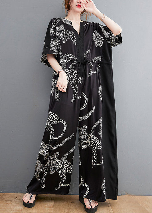 Simple Black V Neck Print Tie Waist Jumpsuit Summer LY3056