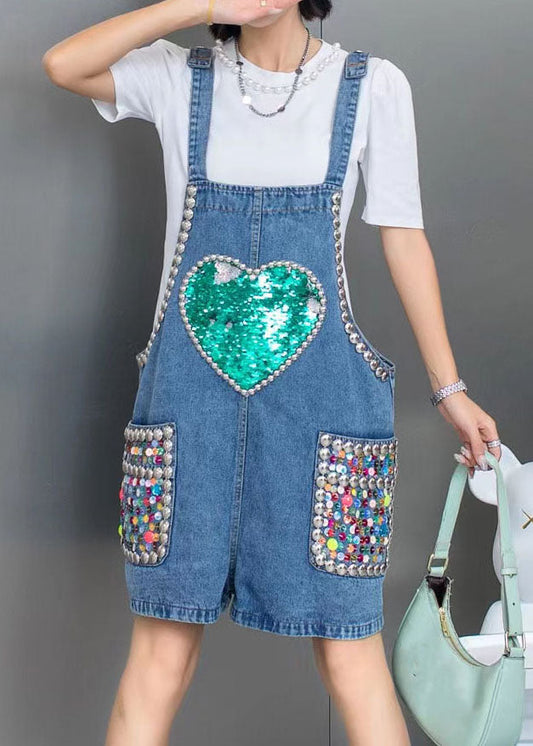 Boho Blue Nail Bead Sequins Patchwork Denim Jumpsuit Shorts Summer LY5227