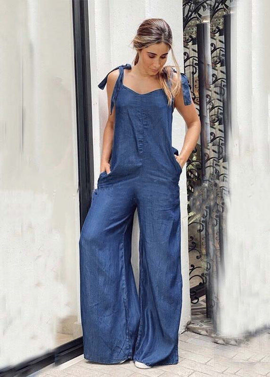 Women Blue Oversized Pockets Denim Wide Leg Jumpsuit Summer LY4021