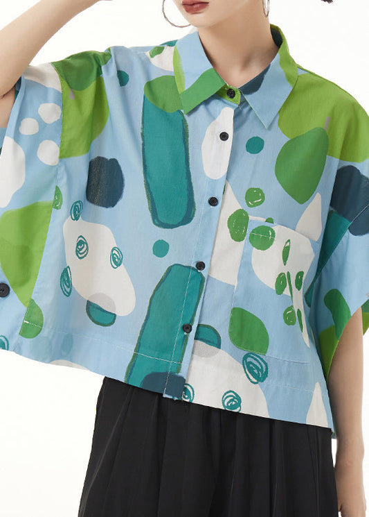 Italian Green Print Button Patchwork Cotton Blouses Batwing Sleeve LY9486