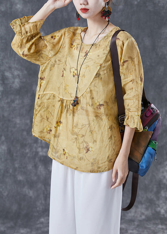 Boho Yellow Patchwork Print Linen Blouse Tops Bracelet Sleeve LY4134