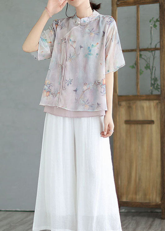 Light Purple Patchwork Cotton Blouses Tasseled Chinese Button Summer LY3969