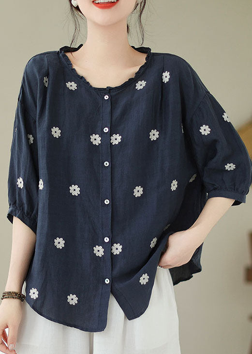 Navy Patchwork Linen Blouses Embroideried Ruffled Summer LY3942
