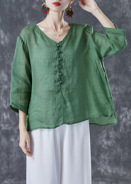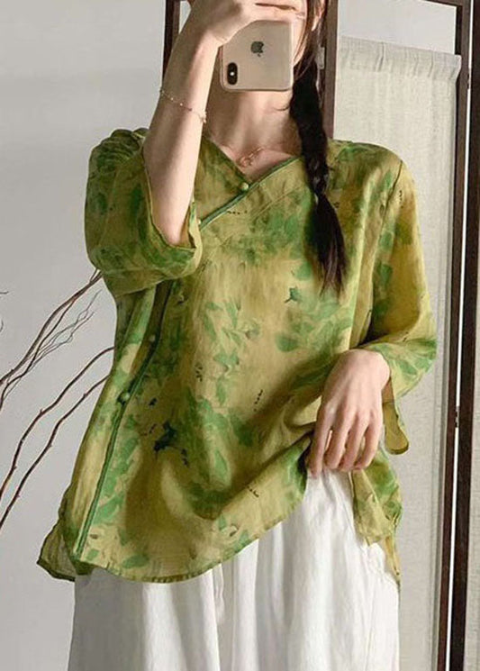 Blackish Green Patchwork Linen Blouses Oversized Print Summer LY4119