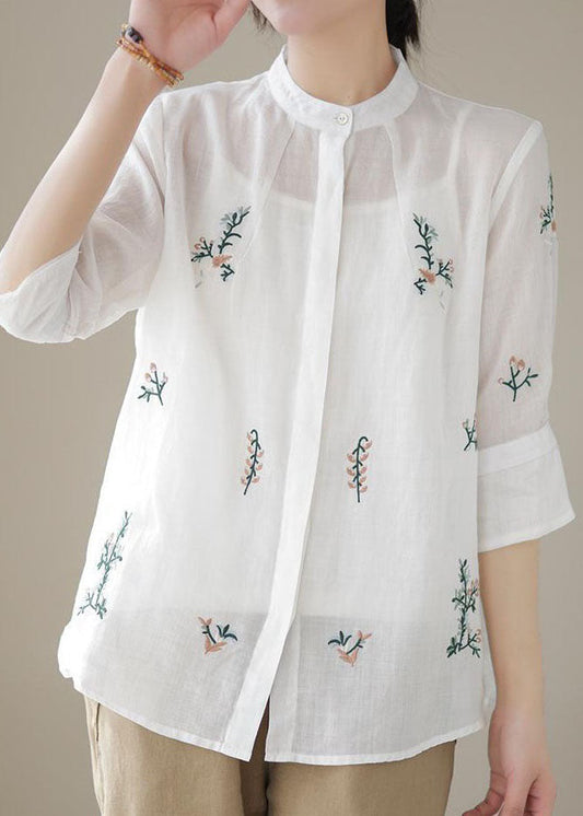 White Patchwork Linen Blouses Embroideried Stand Collar Summer LY4035