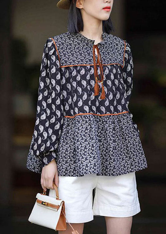 Chic Black Peter Pan Collar Print Patchwork Chiffon Blouse Tops Spring LY3834
