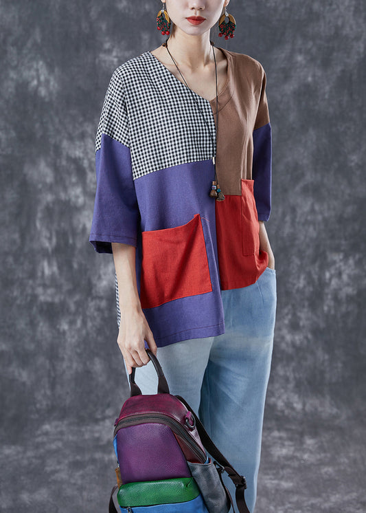 Art Colorblock Asymmetrical Patchwork Plaid Cotton Blouse Top Summer LY4128