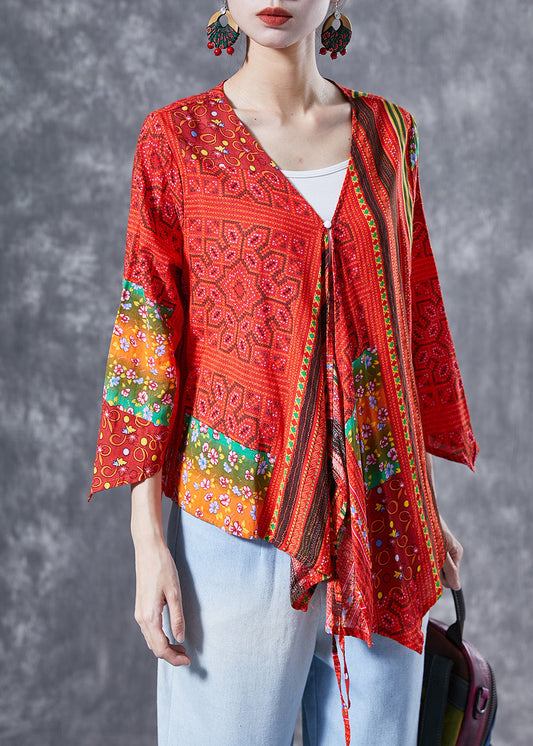 Orange Patchwork Cotton Blouse Top Oversized Lace Up Bracelet Sleeve LY4047