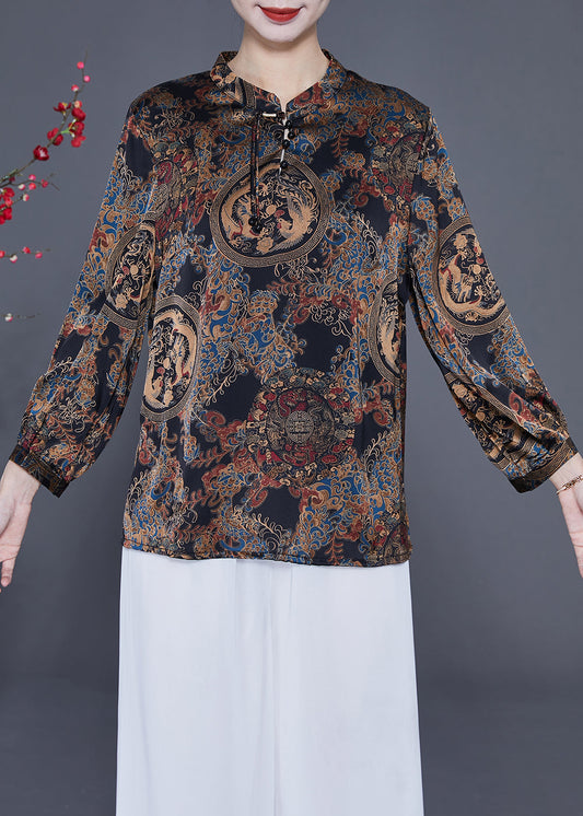 Black Print Silk Blouse Tops Stand Collar Tassel Spring LY2349