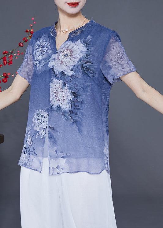Blue Print Chiffon Blouse Tops V Neck Side Open Summer LY2341
