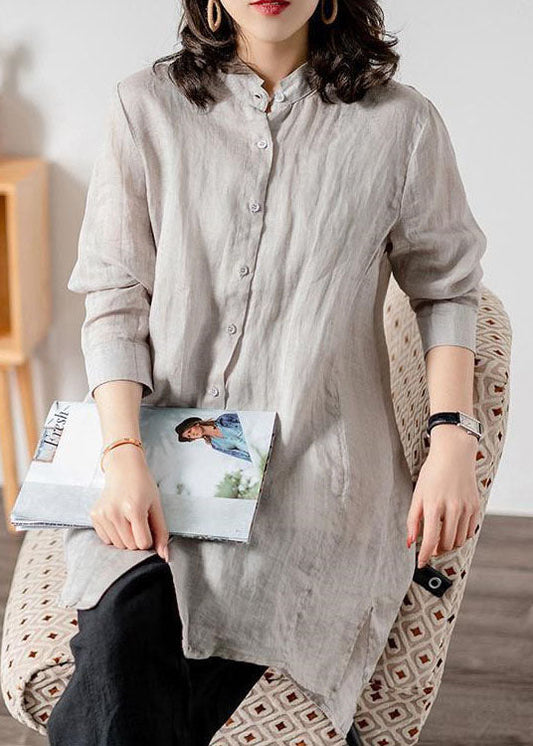 Grey Patchwork Linen Blouses Button Bracelet Sleeve LY1476