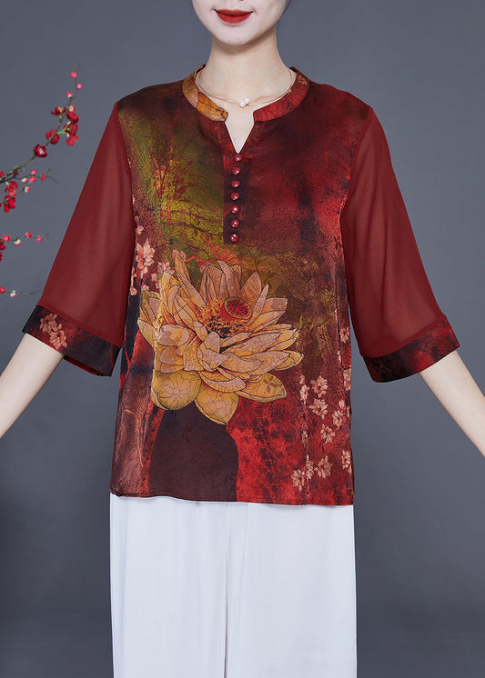 Italian Red Print Patchwork Silk Blouses Half Sleeve LY2338