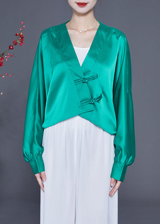Lake Green Oversized Silk Blouses V Neck Chinese Button Spring LY2333