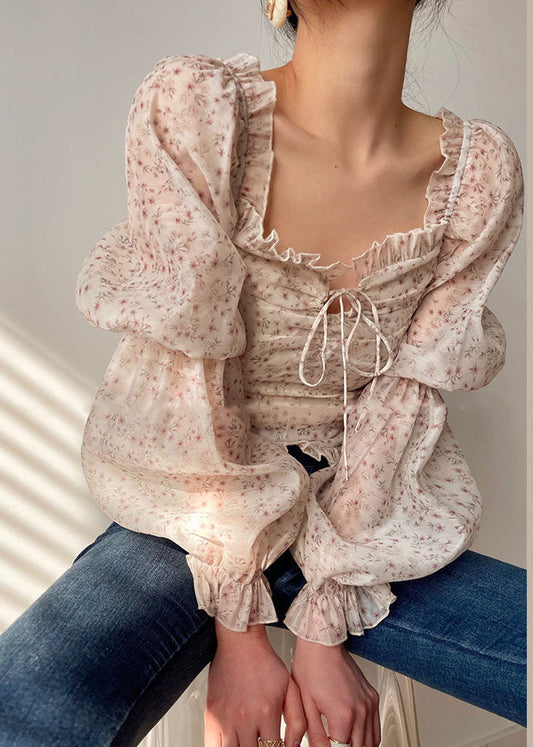 Style Beige Slash Neck Print Ruffles Sexy Blouse Top Long Sleeve LC0480