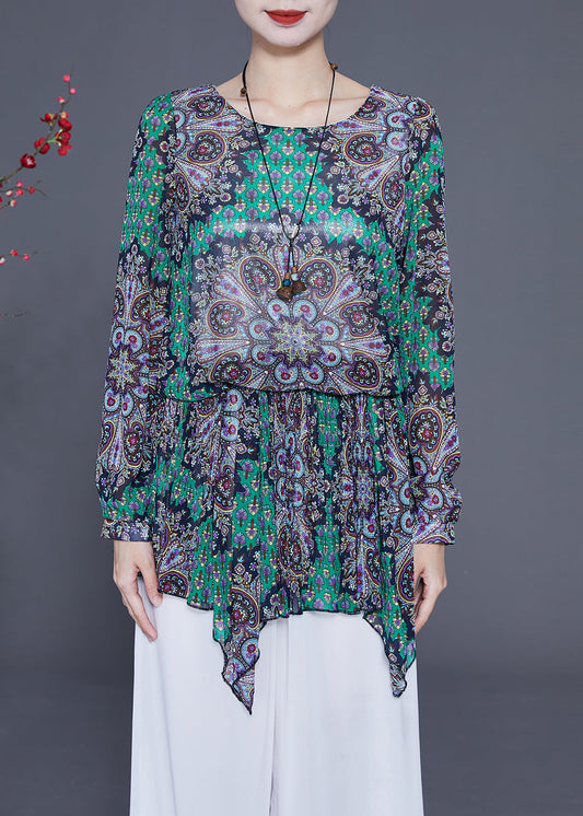 Style Green Print Asymmetrical Design Chiffon Blouses Spring LY2334