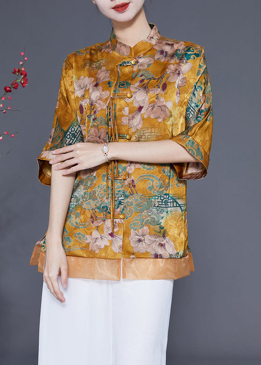 Women Yellow Stand Collar Patchwork Tassel Silk Blouses Half Sleeve LY1856