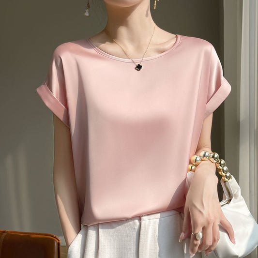 Short-Sleeve Round Neck Plain Satin T-Shirt
