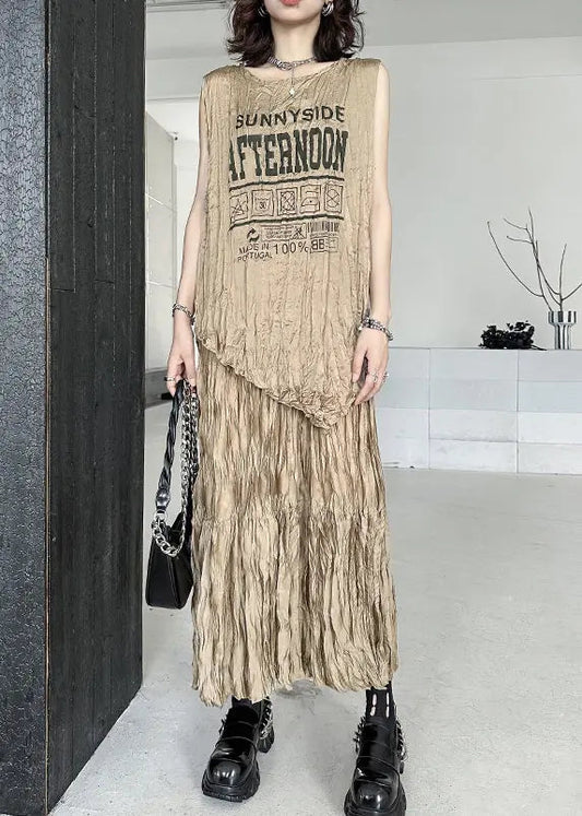 Classy Khaki Oversized Print Linen Two Piece Set Outfits Summer LY8044