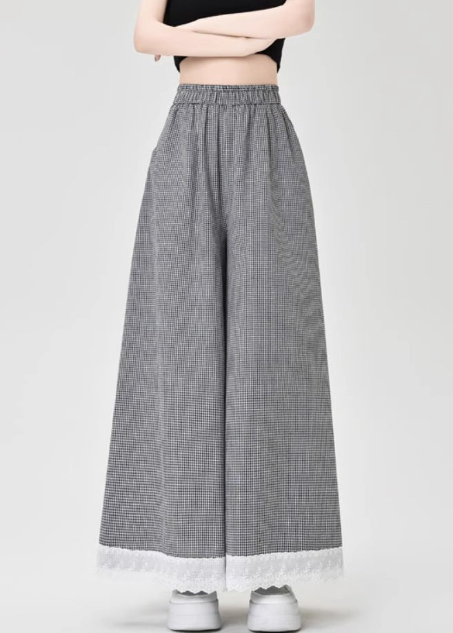 French Black Plaid Lace Patchwork Cotton Wide Leg Pants Summer