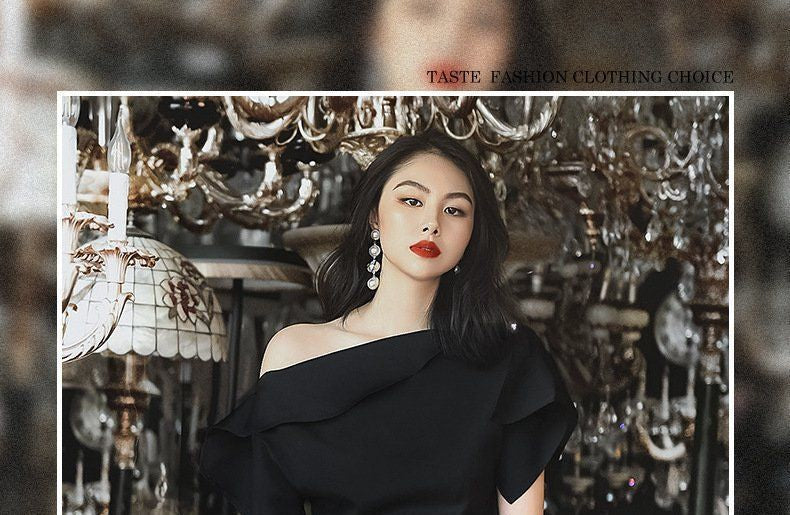 Set: One-Shoulder Short-Sleeve Blouse + Asymmetrical Hem Mini Skirt