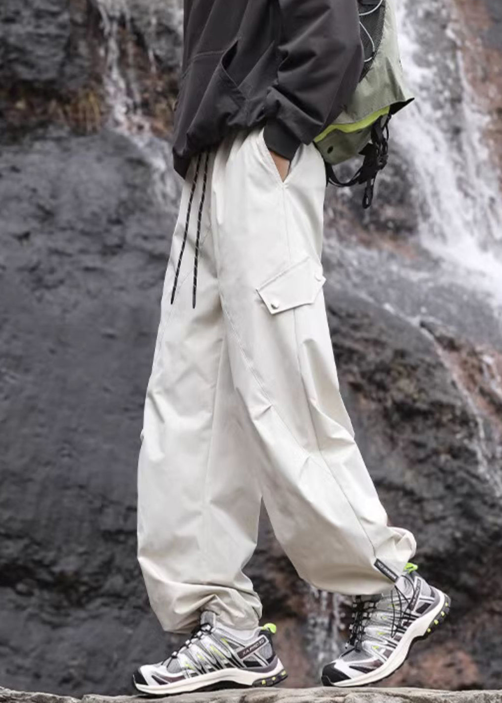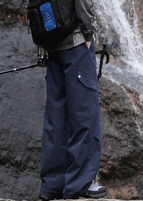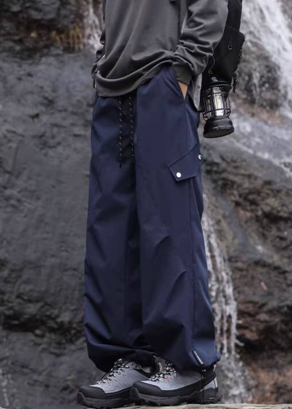 Casual Navy Pockets Lace Up Elastic Waist Cotton Mens Pants Spring