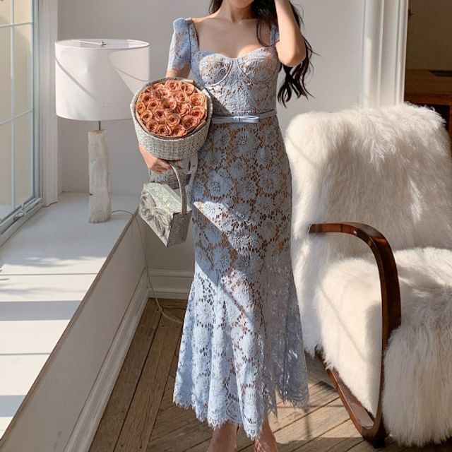 Short Sleeve Sweetheart Neck Bow Lace Overlay Midi Mermaid Dress