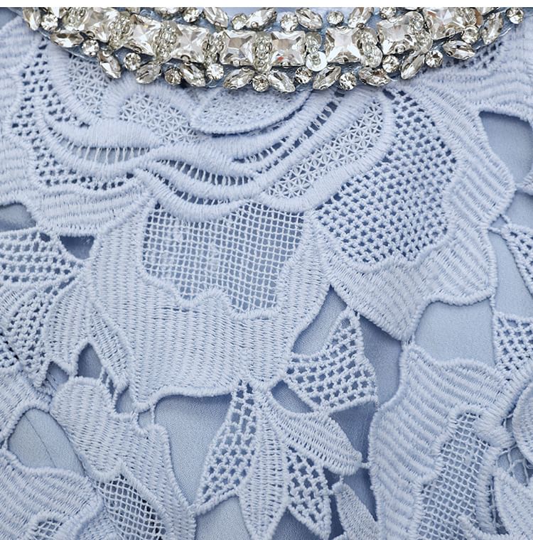 Sleeveless Round Neck Plain Rhinestone Lace Mini A-Line Dress