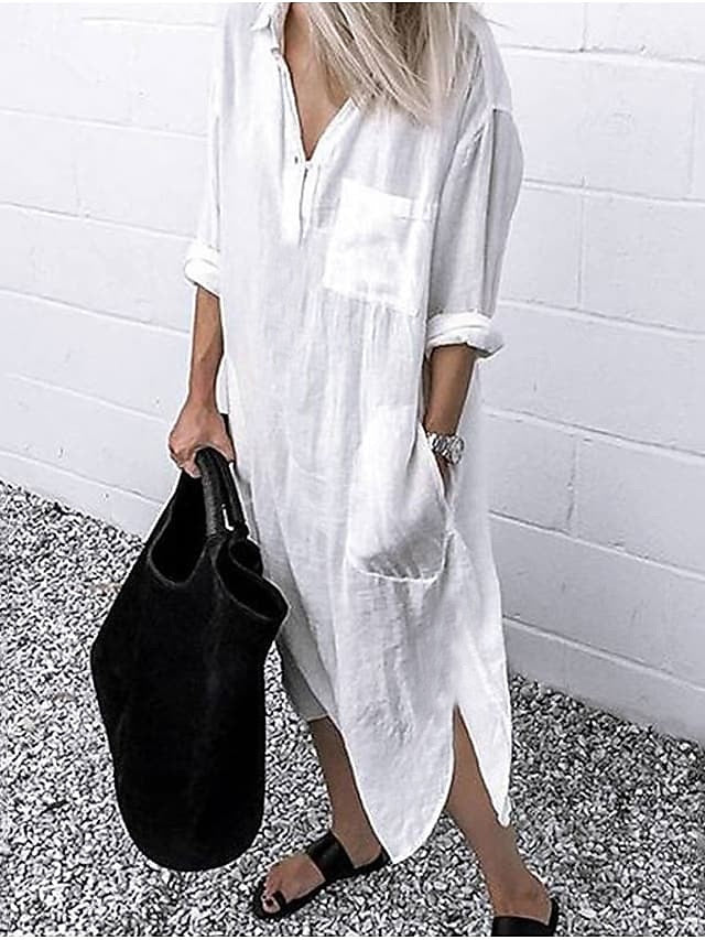 Dresses Type: Swing Dress, Linen-Inspired Dresses, White Dress, Casual Dress, Shirt Dress, Fabric: Polyester, Linen texture style, Gender: Women's, Design: Rolled Cuff, Pocket, Occasion: Winter Dress, Fall Dress, Weekend, Daily, Vacation, Style: Casual, Basic, Fit Type: Loose Fit, Dress Length Type: Maxi long Dress, Neckline: Shirt Collar, Fly Type: Single Breasted, Sleeve Length: Long Sleeve, Elasticity: Micro-elastic, Look After Me: Machine wash, Pattern: Pure Color, Season: Spring, Summer, Fall, Autumn,