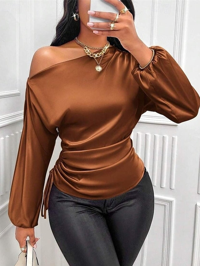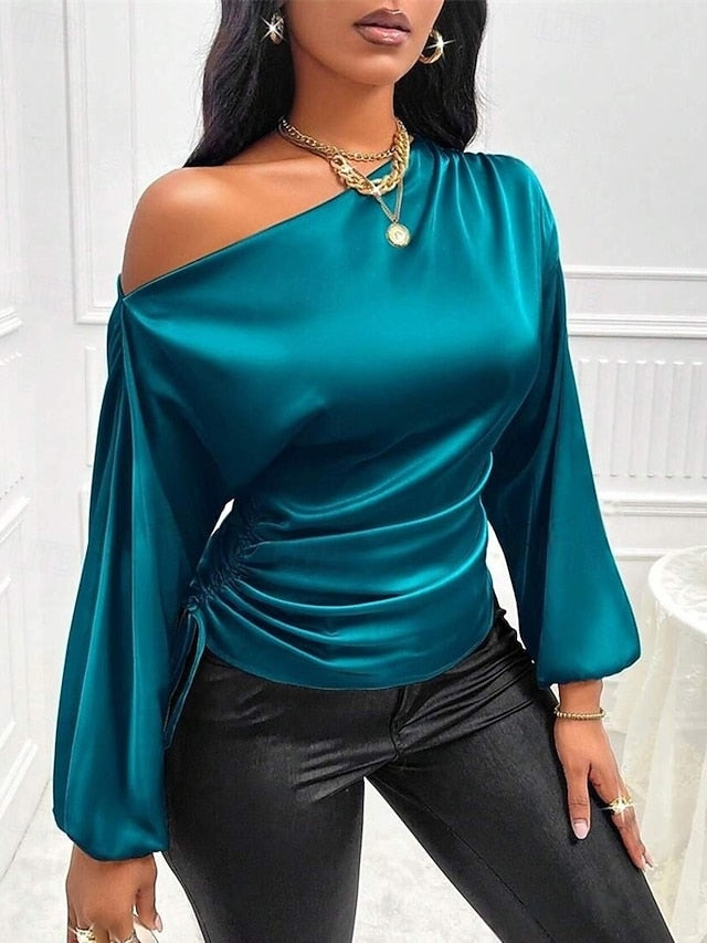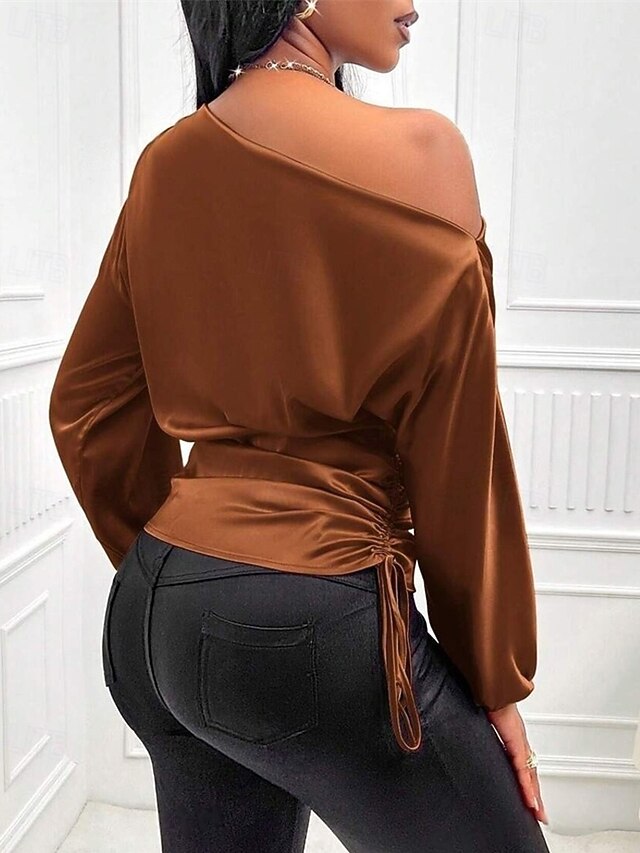 Tops Type: Silky Tops, Satin Top, Dressy, Elegant, Satin Shirt, Shirt, Fabric: Polyester, Gender: Women's, Design: Asymmetric, Occasion: Going out, Daily, Style: Basic, Elegant, Casual, Stylish, Fit Type: Regular Fit, Neckline: Cold Shoulder, Sleeve Length: Long Sleeve, Elasticity: Inelastic, Look After Me: Hand wash, Machine wash, Top Length: Regular Tops, Pattern: Plain, Season: Summer, Fall, Spring,