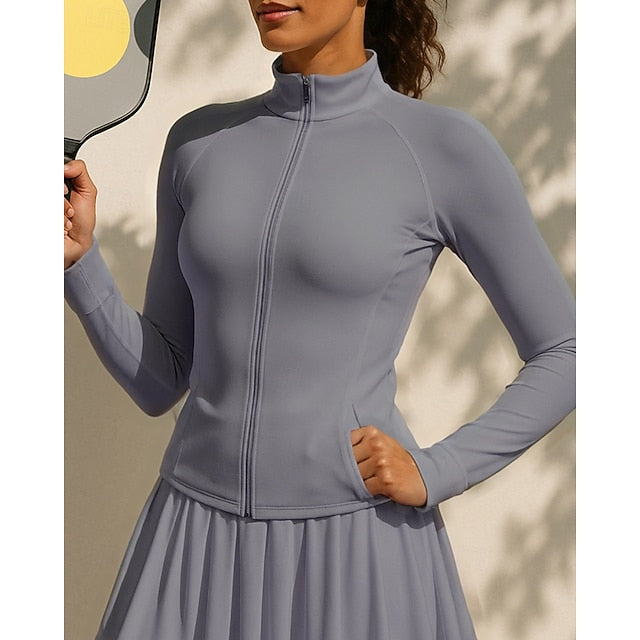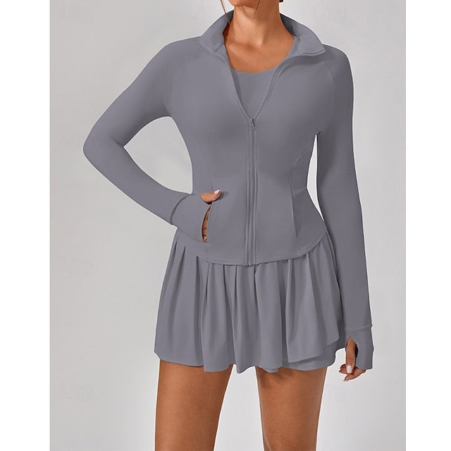 Gender: Women's, Sports Clothing Sub Category: Tennis Skirts with Shorts, Casual Skirt, Tennis Set, Tennis Sports Jacket, Clothing Type: Top, Activity: Pickleball, Running, Tennis, Yoga, Occasion: Sports & Outdoor, Athletic, Outdoor, Season: Summer, Elasticity: Stretchy, Function: Quick Dry, Breathable, Fabric: Spandex, Sleeve Length: Long Sleeve, Waistline: Mid Waist, Design: Zipper, Pocket, Neckline: Standing Collar, Pattern: Solid Colored, Look After Me: Wet and Dry Cleaning, Washable, Waist (cm): S:67;M:71;L:75;XL:79, Length (cm): S:50;M:51;L:52;XL:53, Sleeve Length (cm): S:72;M:72.5;L:73;XL:73.5, Listing Date: 05/28/2025,