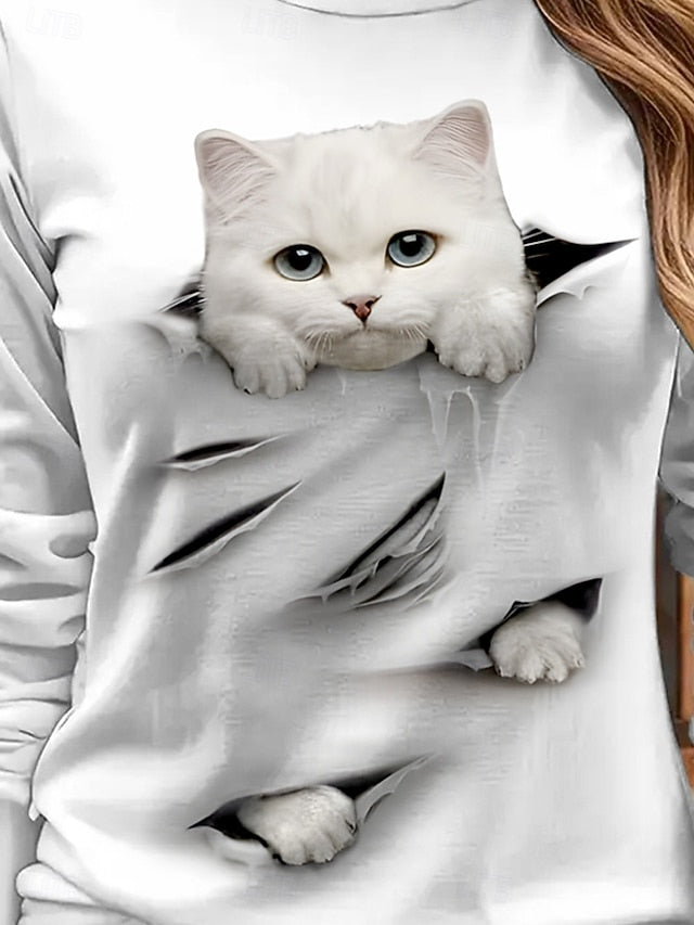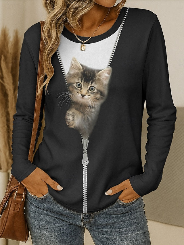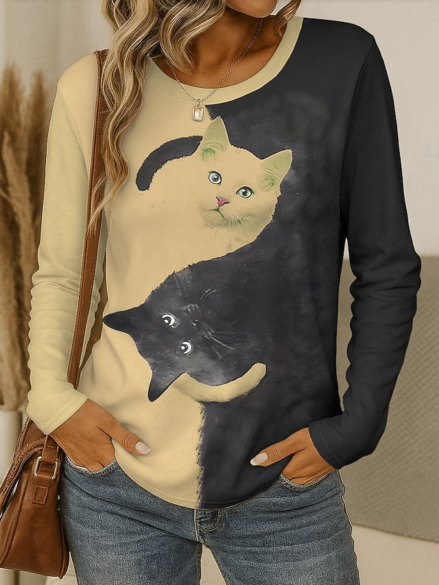 Fabric: Polyester, Tops Type: T Shirt, Gender: Women's, Design: Print, Occasion: Weekend, Daily, Style: Classic, Stylish, Vintage, Casual, Trendy, Category: T-Shirt, Fit Type: Form Fit, Neckline: Crew Neck, Round Neck, Sleeve Length: Long Sleeve, Elasticity: Micro-elastic, Look After Me: Machine wash, Top Length: Regular Tops, Pattern: Graphic, Animal, 3D, Cat, Season: Fall, Spring,