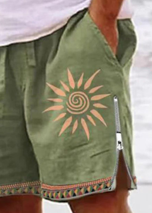 New Green Zip Up Print Elastic Waist Cotton Men Shorts Summer