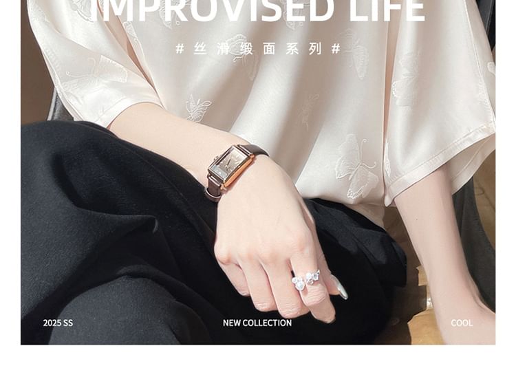 Elbow-Sleeve Boat Neck Butterfly Jacquard Satin Blouse